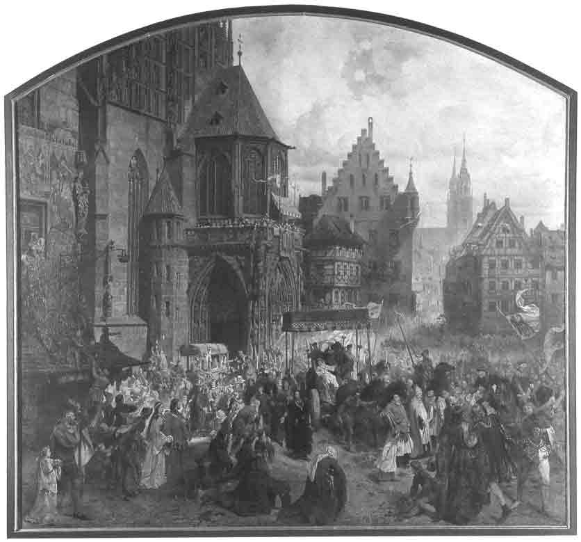 Das Gemälde war damals eine Zierde des Rathaus (heute in Industrie- und Handelskammer in Nünberg) und wird von allen Besuchern mit Bewunderung betrachtet. Eine ganze Reihe herrliche anderer Gemälde, die fast nur in feste Hände übergingen, wie "Alte Schau", "Schöner Brunnen", Sakramentshäuschen in der Lorenzkirche", und viele andere.